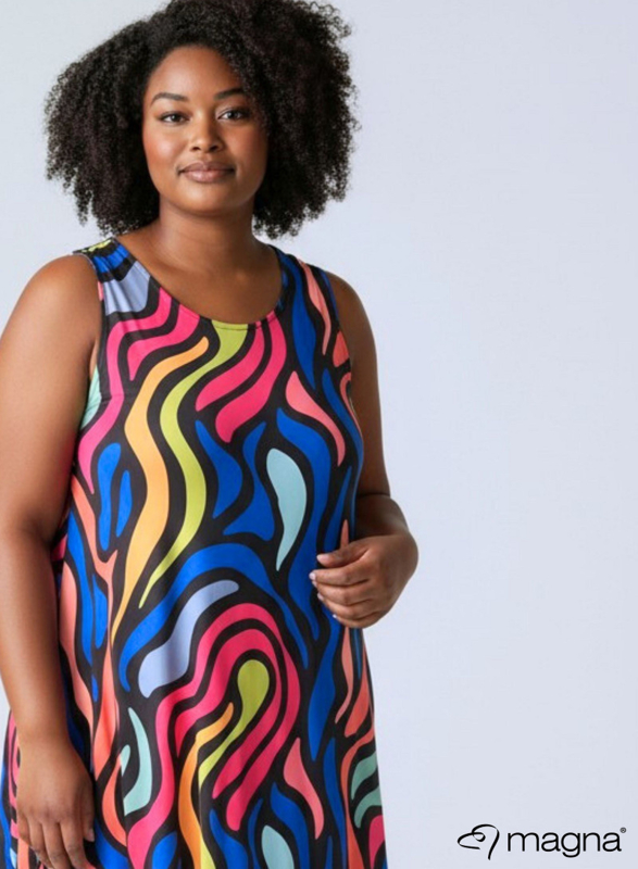 A-Shaped Sleeveless Split Dress (C-2323-PRINT) T30060-Bold Lines Waves Blue-Pink