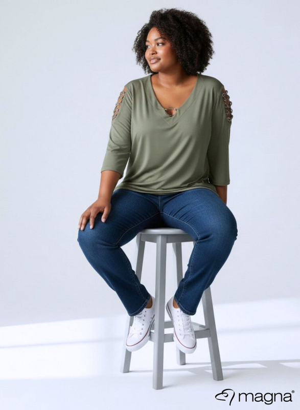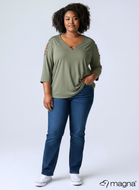 Leuke tuniek met ringen op de mouwen en bij de halslijn.