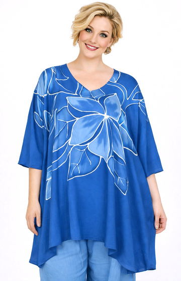 Flora (08-3071-lblueonblue)Prachtige comfortabele tuniek met handgeschilderde motieven van eerst kwaliteit rayon.