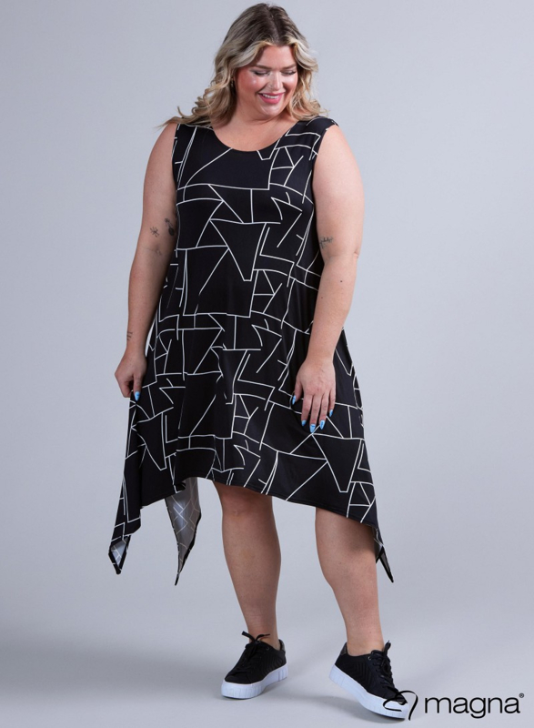A-Shaped Sleeveless Split Dress (C-2323-PRINT) X77001-Geo Lines BlackA-Line Jurk/Tuniek zonder mouwen en punten aan de onderkant.